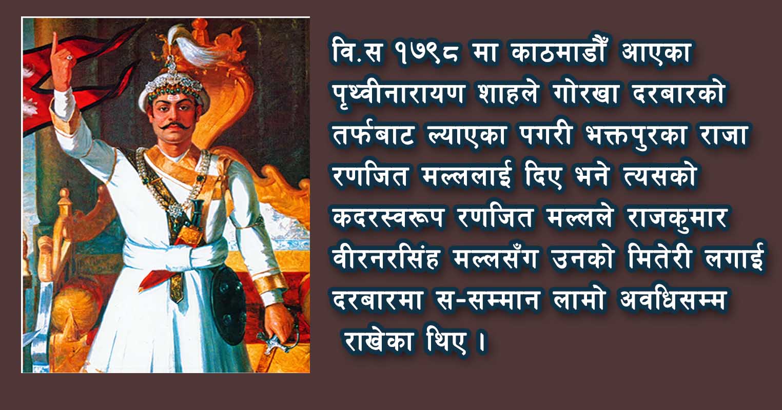 वि.स १७९८ मा काठमाडौँ आएका पृथ्वीनारायण शाहले गोरखा दरबारको तर्फबाट ल्याएका पगरी भक्तपुरका राजा रणजित मल्ललाई दिए भने त्यसको कदरस्वरूप रणजित मल्लले राजकुमार वीरनरसिंह मल्लसँग उनको मितेरी लगाई दरबारमा स–सम्मान लामो अवधिसम्म राखेका थिए । गोरखा फर्किदा चाँगुनारायण, पशुपति र गुहेश्वरी पशुपतिनाथको दर्शन गर्न गएको कुरा थाहा पाई काठमाडौँका राजा जयप्रकाश मल्लले उनलाई दरबारमा ल्याई उनीसँग मितेरी लगाएका थिए ।