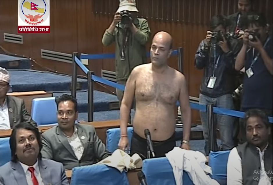 काठमाडौं । प्रतिनिधिसभा सदस्य अमरेशकुमार सिंहले संसदमै लुगा खोलेर अनौठो व्यवहार प्रदर्शन गरेका छन् । विनियोजन विधेयकको सिद्धान्त र प्राथमिकतामाथि छलफल प्रारम्भ हुनभन्दा पहिले विशेष समयको प्रबन्ध नगरिएका करण उनलाई आफ्नो कुरा राख्न सभामुख देवराज घिमिरेले अनुमति दिएनन् ।