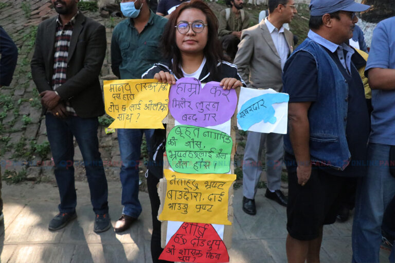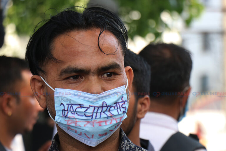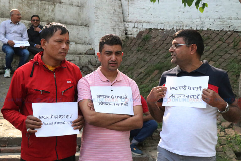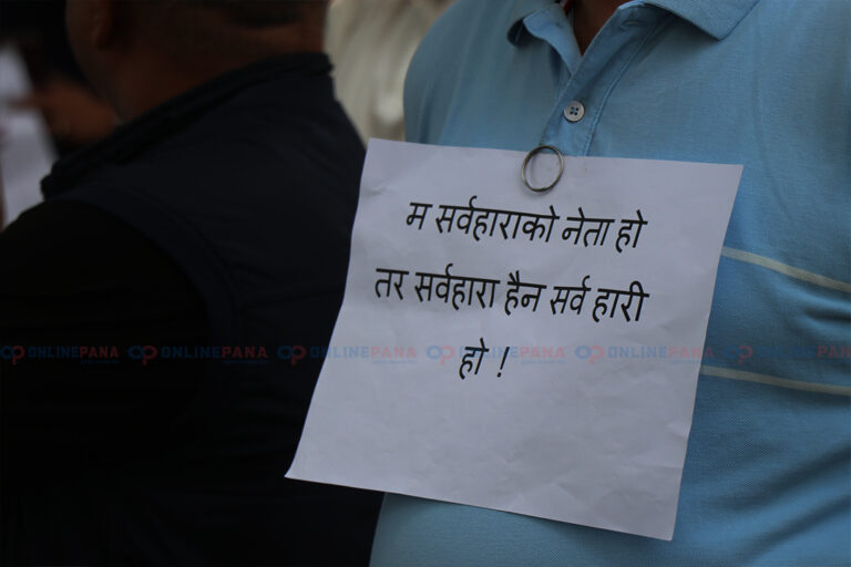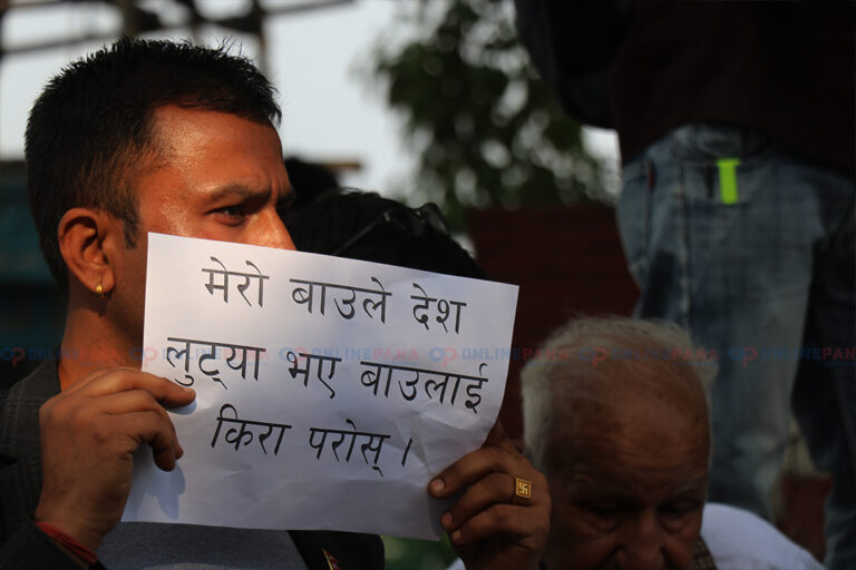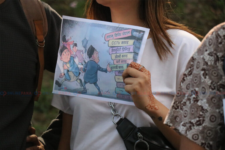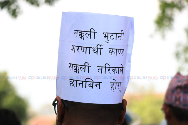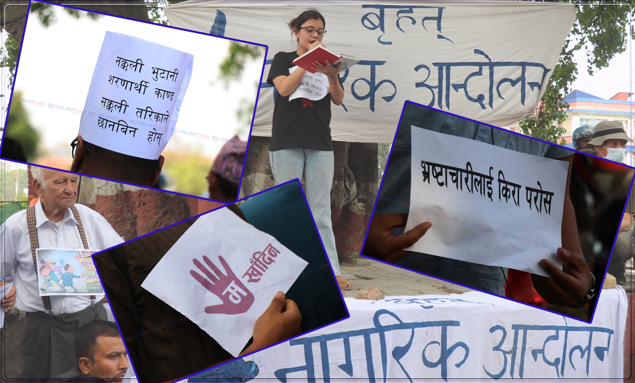 प्रदर्शनमा सहभागीहरूले ‘नक्कली भुटानी शरणार्थीको काण्डको सक्कली छानबिन होस्, खोई कर, भ्रष्टाचारको पेटमा, मानव तस्करीको दश हात, टोपबहादुरलाई ओलीको साथ’ लगायत नारा लेखिएका प्लेकार्ड बोकेर विरोध गरेका छन् ।