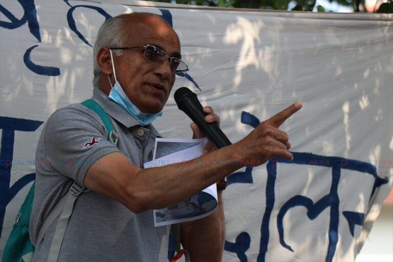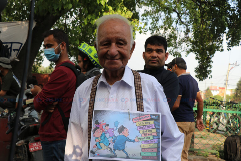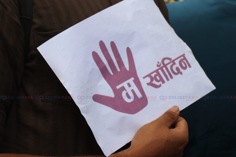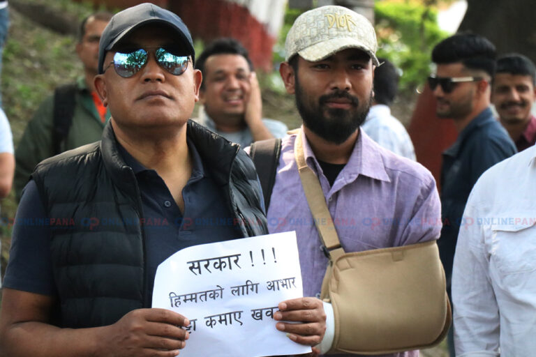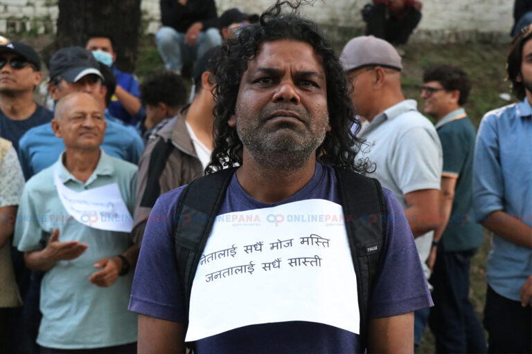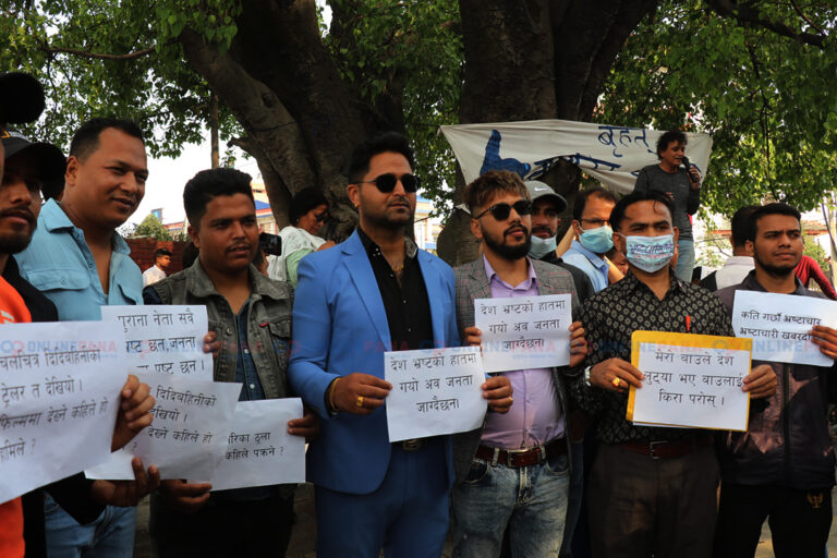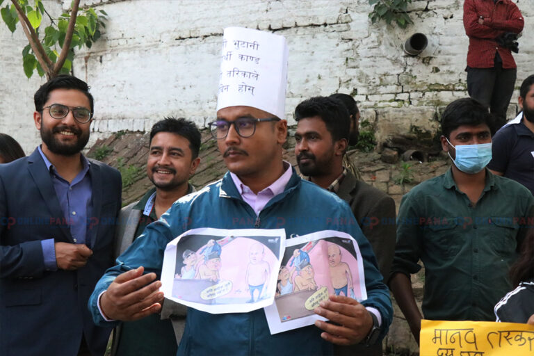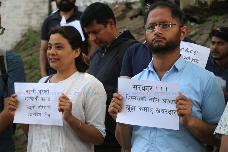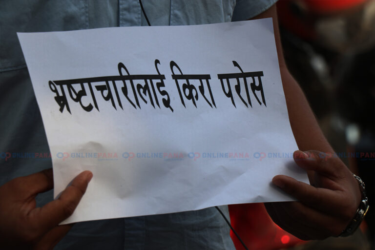 प्रदर्शनमा सहभागीहरूले ‘नक्कली भुटानी शरणार्थीको काण्डको सक्कली छानबिन होस्, खोई कर, भ्रष्टाचारको पेटमा, मानव तस्करीको दश हात, टोपबहादुरलाई ओलीको साथ’ लगायत नारा लेखिएका प्लेकार्ड बोकेर विरोध गरेका छन् ।