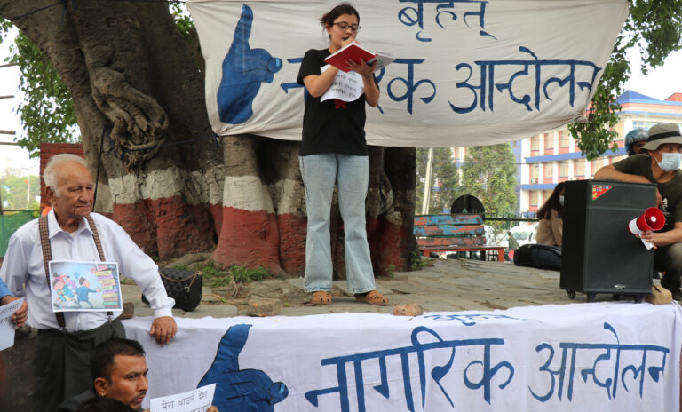 काठमाडौ । बृहत् नागरिक आन्दोलनले भ्रष्टचार ढाकछोप विरुद्ध सडकमा प्रर्दशन गरेको छ । नक्कली भुटानी शरणार्थी प्रकरणमा भ्रष्टचारीलाई लुकाउन खोजिएको भन्दै नागरिक आन्दाेन सडकमा उत्रिएकाे हाे ।