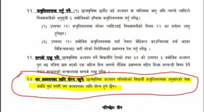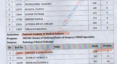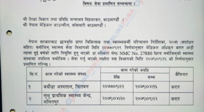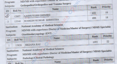 ६३२ र्याङ्क तथा १२८५७ रोल नम्बर भएका उनी ‘अर्थोपेडिक्स र ट्रमा सर्जरी’ विषयअन्तर्गत बीर अस्पतालमा अध्ययनका लागि भर्नामा सिफारिश भएका छन् । करार सेवा गएको पुस ११ गते सकिने उनले गएको मंसिर ५ गतेसम्म रहेको प्रवेश परीक्षाको फर्म कसरी भरे र गएको पुस २ गतेको प्रवेश परीक्षा कसरी दिन पाए भन्ने प्रश्न उब्जिएको छ ।