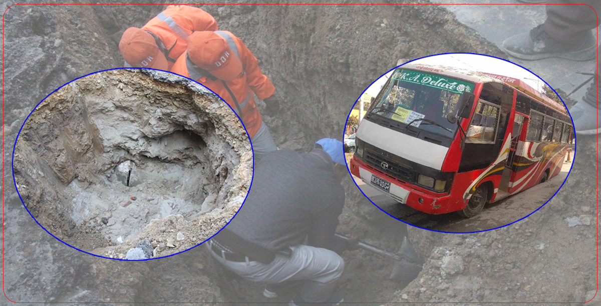 सडक मुनि ढल पाइप बीचमा ग्याप भएकोले बानेश्वरमा भासिएको थियो बस [तस्बिरहरू]