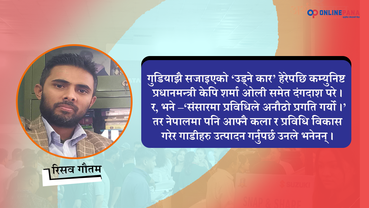 भृकुटीमण्डपमा प्रर्दशनमा राखिएको ‘उड्ने कार’ नेपालीहरुले हेरे, छुन पाएनन्, चड्ने धेरै परको कुरा होला । ‘उड्ने कार’ देखाएर दर्शक भित्राउने गाडी शाहुहरुको गज्जबको फर्मुला पनि हो । त्यसमाथी समाजबादको डम्फु बजाउँदै आएका कम्युनिष्ट प्रधानमन्त्रीले उद्घाटन नै गरिदिएर हौसल्ला भरे । मानौं, अब समाजवाद ‘उड्ने कार’सँगै आउँछ । अर्का पुर्बप्रधानमन्त्री प्रचण्डले त प्रर्दशनीको अवलोकन गर्दै ‘उड्ने कार’ भित्र बसेरै हरे । सायद समाजवादको अनुभव भयो पनि होला ।