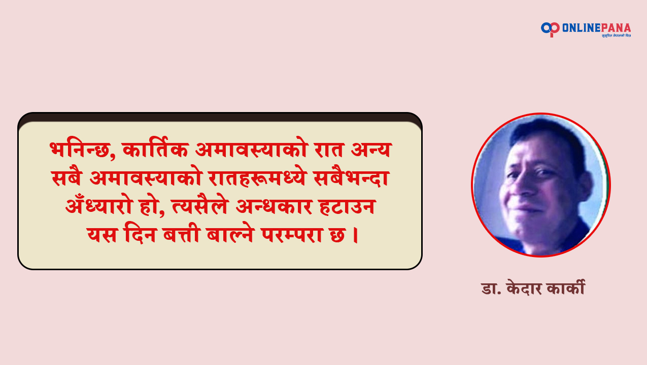 काठमाडाैं । दीपावली/दिवाली पर्व प्राचीन कालदेखि नै मनाइँदै आएको छ । यद्यपि, यो पर्व मनाउने तरिकाहरू पनि समयसँगै परिवर्तन भएका छन्। हिन्दू पात्रो अनुसार, दीपावली प्रत्येक वर्ष कार्तिक महिनाको कृष्ण पक्ष (कालो पखवाडा) को अमावस्या तिथिमा मनाइन्छ। दीपावली शब्द “गहिरो” (बत्ती) र “अवली” (पङ्क्ति) शब्दहरूबाट आएको हो, जसको अर्थ “बत्तीहरूको पङ्क्ति” हो। यो बत्तीको माला लगाएर मनाइने पर्व हो। वैदिक प्रार्थना “तमसो मा ज्योतिर्गमय” हो, जसको अर्थ “दीपावली” अन्धकारबाट उज्यालोतिर लैजाने पर्व हो।