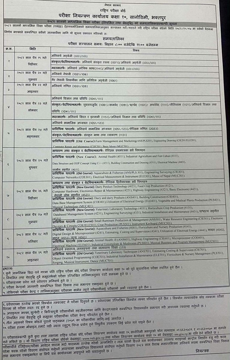 काठमाडाैँ । राष्ट्रिय परीक्षा बोर्डले माध्यमिक शिक्षा परीक्षा (एसईई) को परीक्षा तालिका सार्वजनिक गरेको छ ।