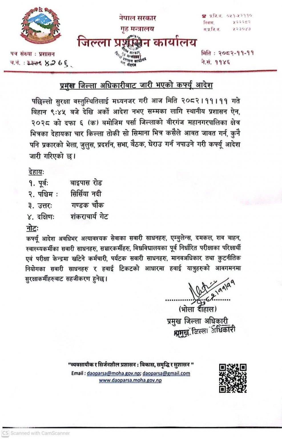 जनकपुरधाम । जिल्ला प्रशासन कार्यालय, पर्साले वीरगञ्ज महानगरपालिकामा कर्फ्यू आदेश जारी गरेको छ । प्रमुख जिल्ला अधिकारी भोलानाथ दाहालले महानगरका केही क्षेत्रमा बिहान पौने १० बजेदेखि अर्को आदेश नभएसम्मलाई कर्फ्यू लगाएका हुन् ।