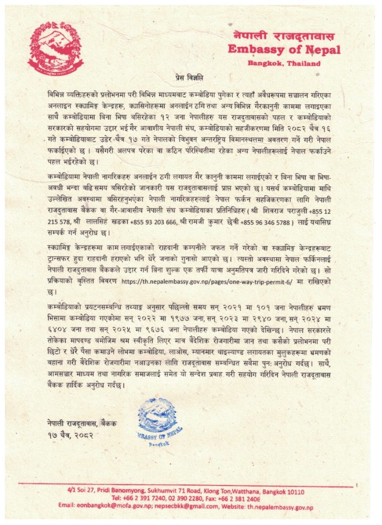 कम्बोडियामा अवैधरुपमा सञ्चालन गरिएका अनलाइन स्क्यामिङ् केन्द्रहरु, क्यासिनोलगायत अन्य गैरकानुनी काममा लगाइएका र बिनाभिसा त्यहाँ बसेकाहरुको उद्धार गरिएको दूतावासले जनाएको छ ।