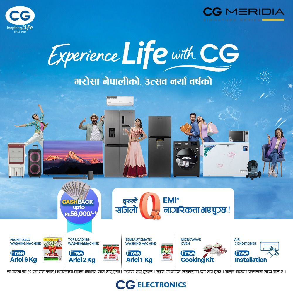 काठमाडौं । इलेक्ट्रोनिक्स ब्रान्ड सीजीले नयाँ वर्ष २०८३ को ‘एक्सपिरेन्स लाइफ विथ सीजी’ योजना ल्याएको छ । आधुनिक प्रविधि र जीवनशैलीलाई केन्द्रमा राख्दै ल्याइएको यस योजनाले उपभोक्तालाई स्मार्ट, सहज र उन्नत जीवनको अनुभव प्रदान गर्ने लक्ष्य राखेको कम्पनीले जनाएको छ ।