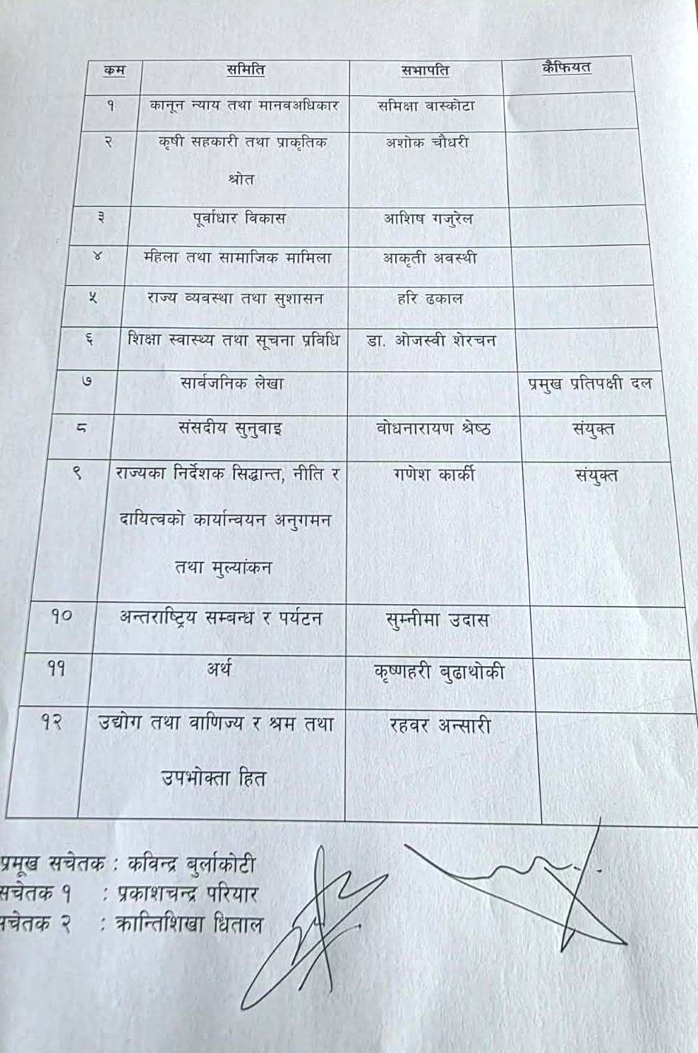 काठमाडौं । प्रतिनिधिसभा अन्तर्गतका १० वटा विषयगत र २ वटा संयुक्त समितिका सभापतिहरूको नाम टुंगो लागेको छ । बिहीबार बसेको रास्वपा संसदीय दलको बैठकले २ संयुक्तसहित १० एकल समितिका सभापतिको उम्मेदवार टुङ्ग्याएको हो ।