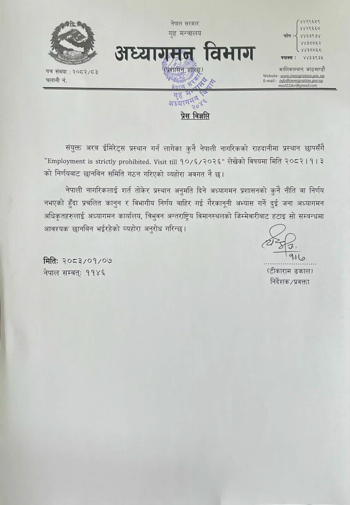 काठमाडाैं । पर्यटक भिसामा युएई जानेको पासपोर्टमा ‘रोजगार निषेध’ भनेर सर्त तोक्ने त्रिभुवन अन्तर्राष्ट्रिय विमानस्थलस्थित अध्यागमन कार्यालयका दुई अधिकृतलाई जिम्मेवारीबाट हटाइएको छ।