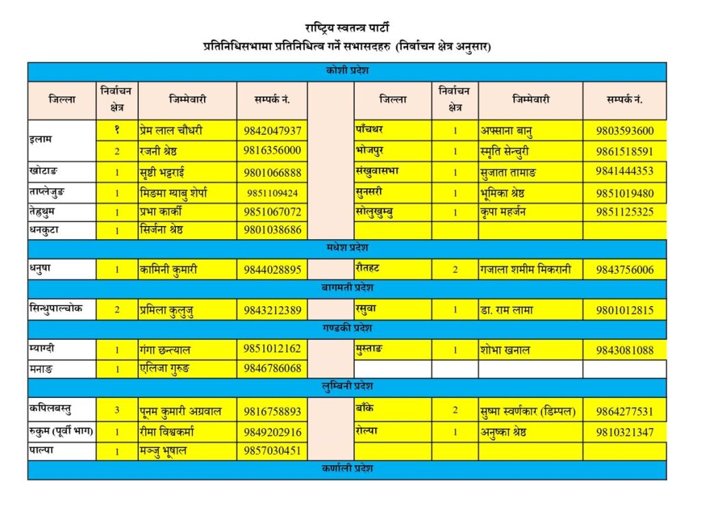 काठमाडौं । फागुन २१ को निर्वाचनमा आफ्नो पार्टीले प्रत्यक्षतर्फ निर्वाचन जित्न नसकेको क्षेत्रमा रास्वपाले समानुपातिक सांसदलाई जिम्मेवारी दिएको छ ।