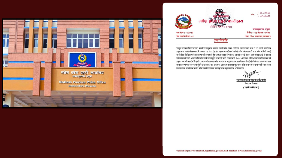 मधेश प्रदेश प्रहरी कार्यालयले विज्ञप्ति जारी गर्दै वरिष्ठ सई जबरालाई निलम्बनको प्रक्रिया अघि बढाइएको जानकारी गराएको छ । जबराले व्यापारीसँग बनावटी कथा रचेर अडियो बनाई आफ्नै कार्यालय प्रमुख तथा संगठनलाई बदनाम गरेको आरोप छ ।