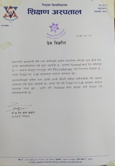 प्रधानमन्त्री ओली सामान्य हिँडडुल गर्न थालेका छन् भने ‘फिजियो थेरापी’लाई निरन्तरता दिइएको छ । यस्तै उनका ‘भाइटल’ र ‘ल्याब’ सूचाकांकहरु सामान्य रहेका छन् ।