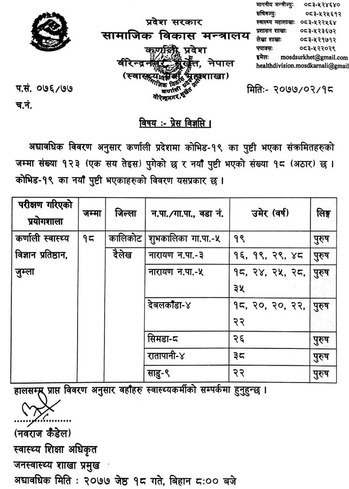 आइतवार बिहान ८ बजे सामाजिक विकास मन्त्रालय कर्णाली प्रदेशले सार्वजनिक गरेको तथ्यांक अनुसार कालिकोटको शुभकालिका गाउँपालिका ५ का १९ वर्षका पुरुषमा संक्रमण पुष्टि भएको हो।