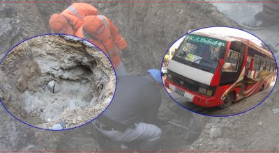 सडक मुनि ढल पाइप बीचमा ग्याप भएकोले बानेश्वरमा भासिएको थियो बस [तस्बिरहरू]